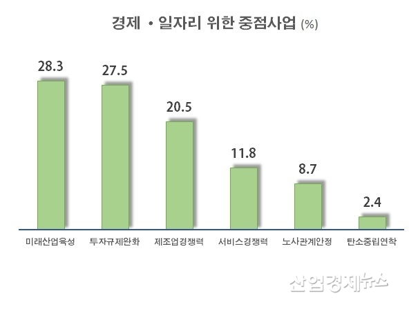 그 다음으로는 서비스산업 경쟁력 강화(11.8%), 노사관계 안정화(8.7%), 탄소중립 연착륙(2.4%) 등의 순서로 응답했다.
