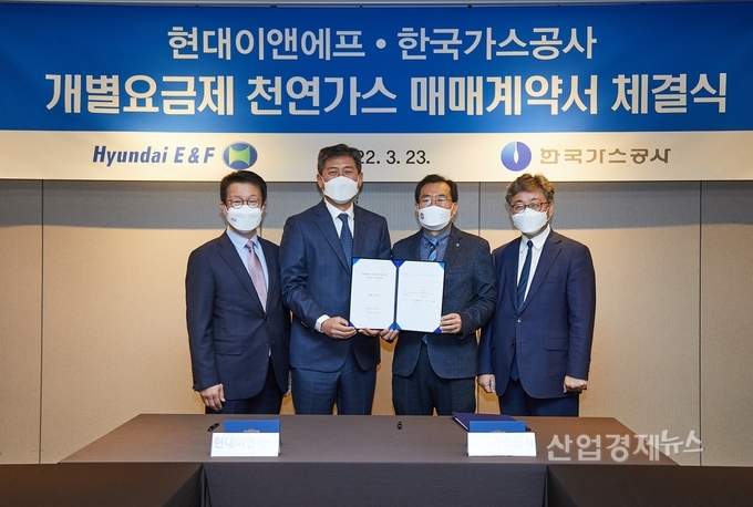 현대E&F는 23일 한국가스공사와 이러한 내용의 천연가스 도입 계약을 체결했다. 2026년부터 9년 동안 연 32만 톤의 천연가스를 현대E&F가 한국가스공사로부터 공급받는 내용이다.