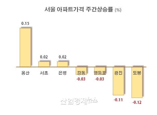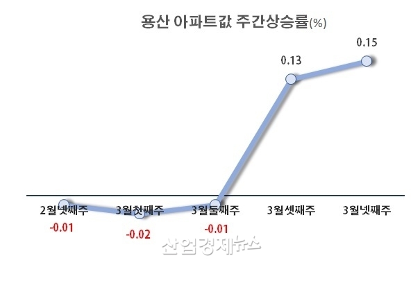 용산의 아파트가격은 지난 2월부터 계속 하락세를 보이고 있었다. 한국부동산원 조사에 따르면 2월 중순부터 2월 말까지 -0.01%의 상승률을 나타내며 미약하지만 가격이 떨어졌고, 3월 들어서도 첫째주 -0.02%, 둘째주 -0.01%로 하락세를 보이고 있었다.