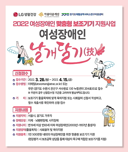 올해로 3년차를 맞은 여성장애인 날개달기는 ESG경영 활동의 일환으로, 국내 최초 ‘여성장애인 맞춤형 보조기기 지원사업’이다. LG생활건강 임직원들이 기부한 급여 일부와 회사의 매칭펀드로 아름다운재단에 조성한 기금으로 운영되고, 경기도재활공학서비스연구지원센터가 협력기관으로 참여한다.