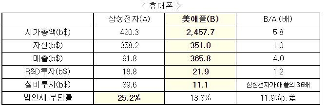 전국경제인연합회(이하 전경련)가 한국 7대 수출 주력업종과 이들 기업의 글로벌 경쟁사를 비교해본 결과, 매출은 45%, 자산은 78%, 시총은 32% 밖에 안됐지만, 조세부담은 10%포인트 높은 것으로 조사됐다.
