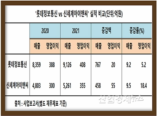 지난해 상반기까지만 해도 매출 증가율에선 롯데정보통신이, 영업이익 증가율에선 신세계아이앤씨(I&C)가 상대보다 더 나은 성적표를 만들어 일진일퇴의 명승부를 펼쳤지만,