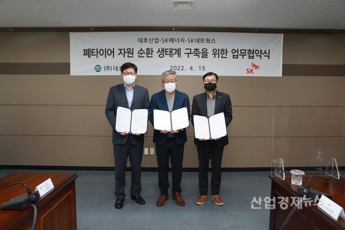 3사는 15일, 광주 하남 산업단지에 위치한 대호산업 광주공장에서 폐타이어 열분해 사업 추진을 위한 업무 협약을 체결했다. 업무협약식에는 대호산업 박종혁 대표이사, SK에너지 홍정의 에너지Net Zero실장, SK네트웍스 장영욱 스피드메이트사업부장 등 3사 주요 관계자들이 참석했다.