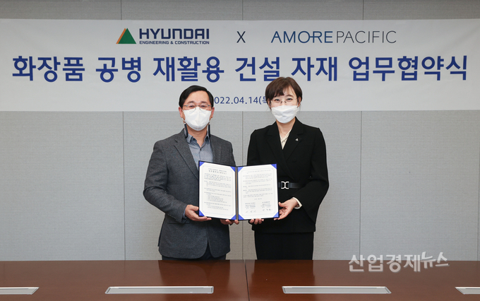 현대건설과 아모레퍼시픽은 화장품 용기 재활용 소재를 사용한 건설 자재 및 디자인 개발에 적극 협력할 예정이다.