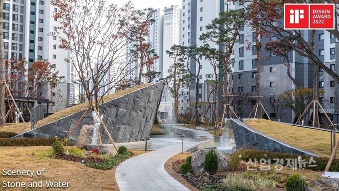 건축 부문을 수상한 ‘스톤 앤 워터(Scenery of stone and water)’은 기존 아파트 단지들의 대표적인 조경 요소인 석가산을 개선한 푸르지오만의 시그니처 조경 상품이다.
