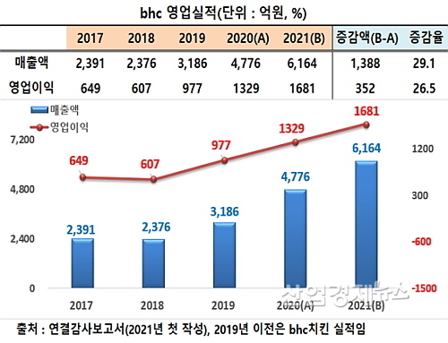 먼저 외형의 경우 코로나 시대 최대 수혜업종으로 손꼽히는 주력기업 bhc치킨이 지난해 4771억의 매출을 올려 전년도 4004억 대비 767억이 급증해 약 24.1% 성장했다. 더불어 지난해 10월 인수한 아웃백스테이크하우스의 매출 약 641억이 가세하며 전사 성장을 합작했다.