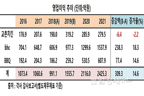 영업이익 신장률, bhc치킨 18.3% BBQ 14.6%...교촌은 –2.2% 뒷걸음