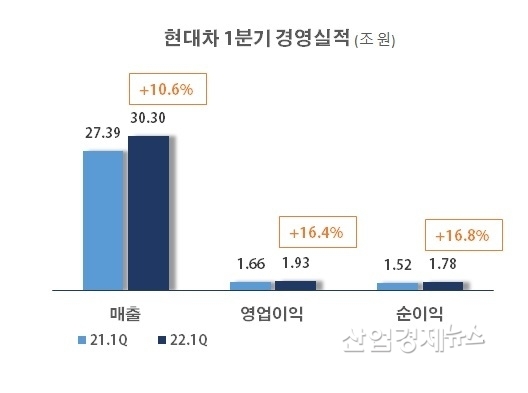 현대차는 올해 1분기에 매출 30조2986억원, 영업이익 1조9289억원, 당기순이익 1조7774억원을 기록했다. 매출은 10.6%, 영업이익은 16.4%, 당기순이익은 16.8% 증가한 실적이다.