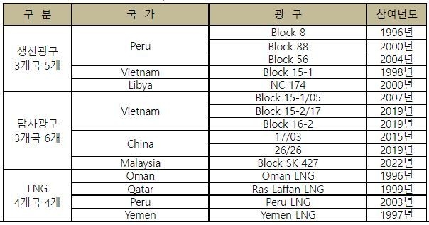 - 8개국 11개 광구, 4개 LNG프로젝트 참여 중