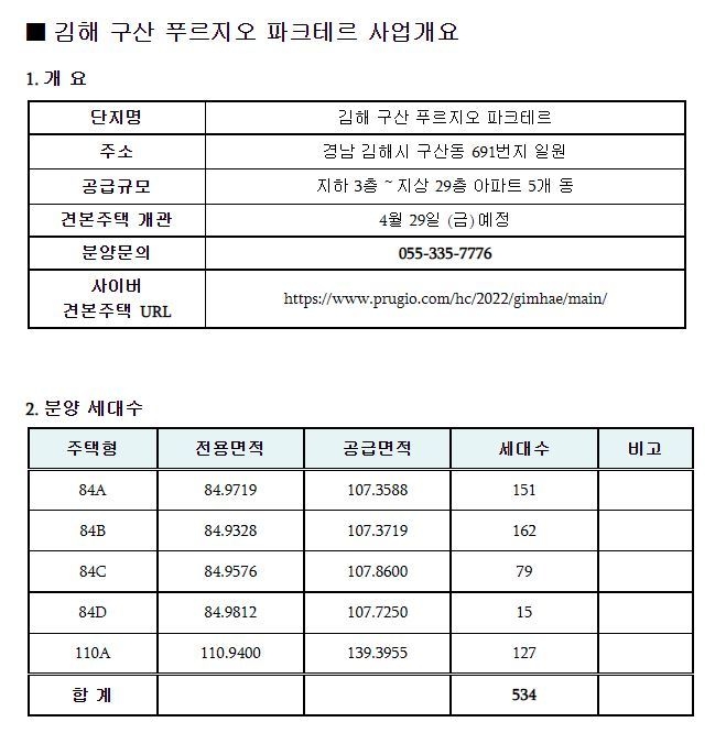 ‘김해 푸르지오 파크테르’는 지하 3층 ~ 지상 29층 5개동 총 534세대 규모이며, 전용면적별 세대수는 84㎡A 151세대, 84㎡B 162세대, 84㎡C 79세대, 84㎡D 15세대, 110㎡A 127세대로 지역내 선호도와 희소성 높은 중대형이 포함된 구성이다.