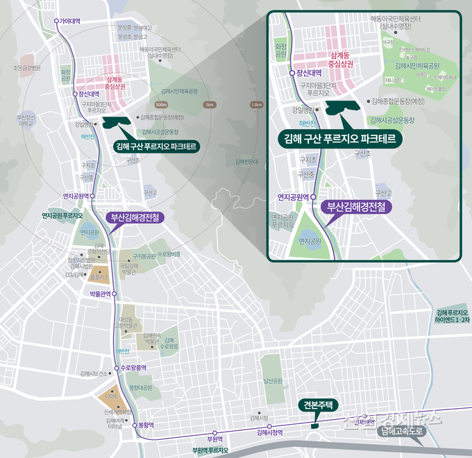 편리한 교통망도 큰 장점이다. 도보 10분 거리에 김해 유일의 도시철도인 장신대역(부산․김해 경전철)이 위치해 있어 부산 대저역까지 20분대, 사상역까지 40분대로 이동이 가능하다. 단지 인근에는 김해 중심도로인 김해대로와 금관대로가 위치하며, 이를 통해 남해고속도로 동김해IC, 부산외곽순환도로 광재IC 진입이 수월하다. 김해 전역은 물론 부산, 창원 등 인접 지역으로 이동하기 쉽다.
