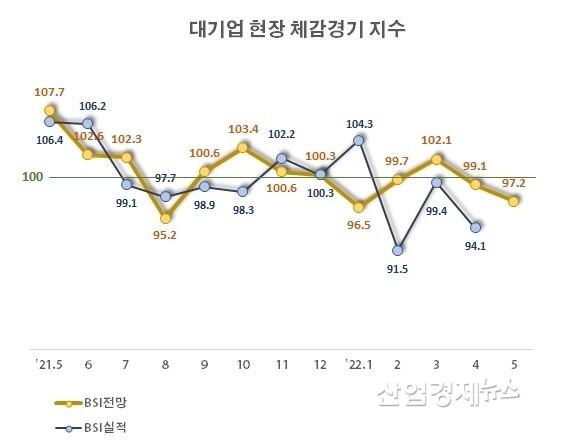전국경제인연합회(이하 전경련)가 매출액 기준 600대 기업을 대상으로 실시한 기업경기실사지수 조사 결과, 5월 전망치는 97.2로 조사돼, 지난 4월의 99.1에 이어 2개월 연속 기준선 100을 하회했다.