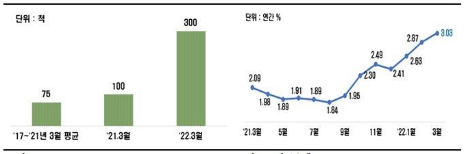 실제로 3년물 기준 회사채 시장금리는 2022년 3월 3.03%로, 전년 동월 대비 0.94%p나 상승했다. 금융통화위원회는 지난 4월 14일 기준금리를 0.25%p인상해서 기준금리 1.25%에서 1.50%로 높아졌다.