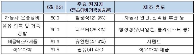 제조업 중 자동차‧운송장비업, 비금속 소재‧제품업 등의 전망이 가장 부진한데, 이는 철광석, 유연탄 등 핵심 원재료 가격의 고공행진이 지속되고 있는 가운데, 중국 물류 중심지인 상해 봉쇄 장기화로 중국 중간재 수입에 차질이 우려되기때문이라는 분석이다.