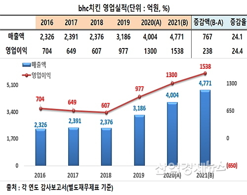 먼저 bhc치킨의 최근 4년간 실적을 살펴보면 실로 놀라움의 연속이다. 2018년부터 지난해까지 4년 동안 한 차례의 예외도 없이 매해 매출과 영업이익 공히 역대 최대치를 갱신하며 승승장구중이다.