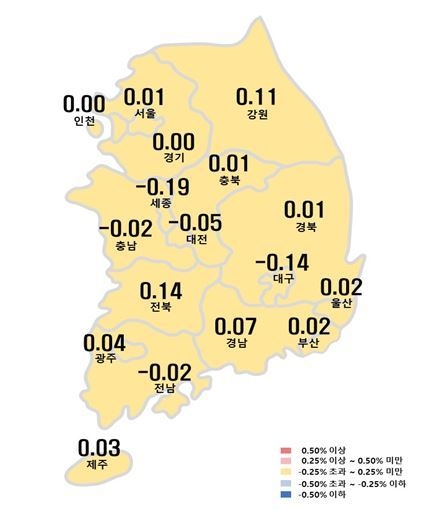 세종시는 -0.19%로 지난해부터 계속 급락세를 보이고 있고, 대구도 -0.14%로 올해로 들어오면서 하락세가 계속 이어지고 있다. 대구의 달서구는 -0.23%, 중구는 -0.19%의 하락세를 보이며 대구 하락세를 이끌었다.