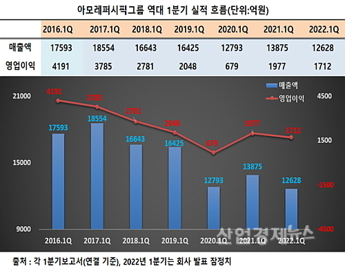 아모레퍼시픽그룹이 최근 공개한 IR보고서(잠정실적)에 따르면 연결재무제표기준 1분기 매출은 1조2628억 원을 시현, 전년 동기 1조3875억 대비 1247억이 줄어 약 9.0% 역 성장했다.
