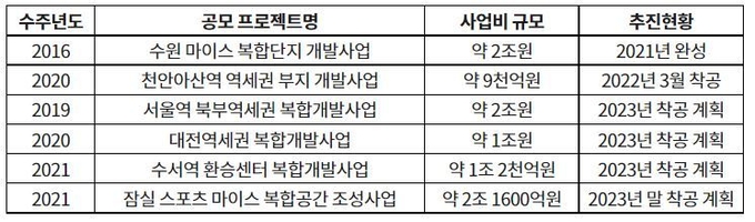내년에는 서울역 북부역세권 복합개발사업, 대전역세권 복합개발사업, 수서역 환승센터 복합개발사업, 잠실 스포츠 마이스 복합공간 조성사업의 연이은 착공을 준비하고 있다.