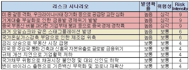 이 설문에서 교수들은, 가계대출 부실화로 인한 금융발 경제위기, 우크라이나사태 장기화 등으로 인한 공급망 교란, 부동산 버블과 과다 기업부채 등으로 인한 중국경제 경착륙 등에 대해서, 발생 가능성이 높고, 국내경제에 미치는 악영향도 가장 심각한 3대 리스크라고 응답했다.