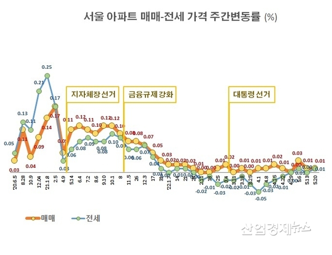하지만 윤석열 정부가 부동산 활성화 정책을 내놓으면서 강남·서초 등의 재건축아파트와 1기신도시의 매매가격이 상승하기 시작했고, 이에따라 전세가격도 4월 부터는 매주 하락폭을 줄여가다가 결국 5월 들어 상승세로 돌아섰다.