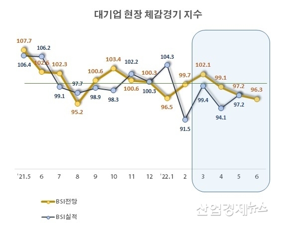 전국경제인연합회(이하 전경련)가 매출액 기준 600대 기업을 대상으로 실시한 기업경기실사지수(BSI : Business Survey Index) 조사 결과, 6월 실사지수의 전망치는 96.3으로 조사됐다.