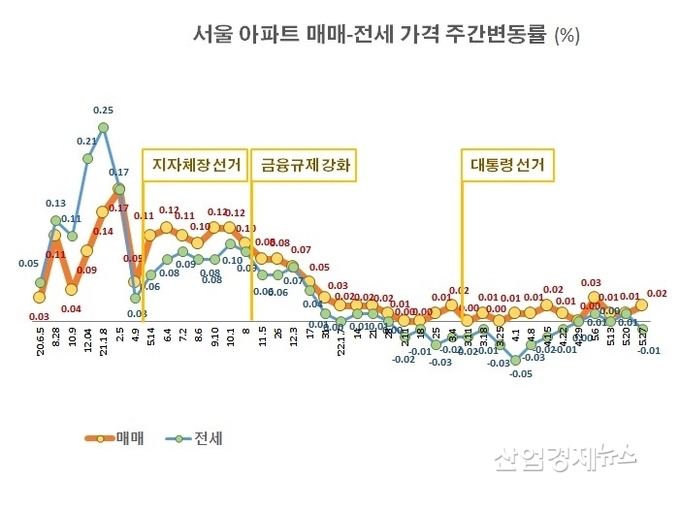 지난 2월 이후 마이너스 상승률을 보이던 서울의 전세가격은 대통령 선거 후 하락폭을 계속 줄이다가 5월 셋째 주 0.01%로 상승세로 돌아 섰지만, 지난주에는 한 주만에 -0.01%를 기록하며 다시 하락세로 돌아섰다.