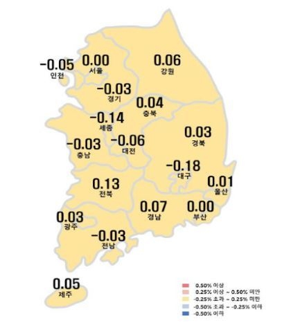 대구 -0.18%, 세종 -0.14%로 지난해 큰 폭으로 올랐던 지역이 지난해 말부터 계속 큰 하락폭을 보이고, 인천 -0.05%, 경기 -0.03% 등 수도권도 하락세를 보이면서, 가격이 큰 폭으로 오른 전북 0.13%, 경남 0.07%, 강원 0.06%의 상승세에도 불구하고 전국 평균은 마이너스 상승률을 기록했다.