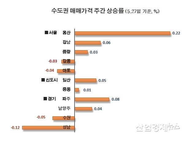 매주 수도권 아파트 매매가격을 조사해 발표하고 있는 부동산114에 따르면, 5월 넷째주 서울 아파트 주간상승률은 0.02%로 조사됐고, 신도시도 0.01%로 상승세를 보였다. 똘똘한 한채가 별로 없는 경기·인천 만 -0.01% 상승률을 기록하며 하락하는 모습을 보였다.