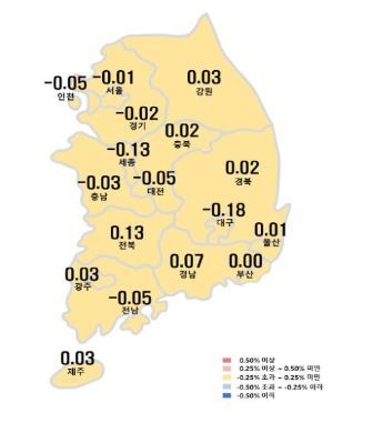 최근 3~4년 급등세를 보였던 대구 아파트가격이 -0.18%, 세종이 -0.13%를 기록하며 지난해 하반기 부터 큰 폭의 하락세를 보이면서, 전북 0.13%, 경남 0.07%의 상승세에도 전국 평균은 마이너스를 유지했다.