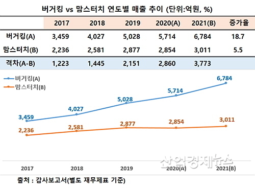 매출증가율, ‘버거킹 18.7% vs 맘스터치 5.5%’...버거킹이 13.2%P 앞서