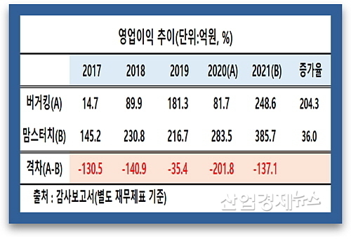 별도재무제표 기준 양사의 지난해 영업이익을 살펴보면 버거킹이 지난해 248.6억 원을 시현, 전년도 81.7억 대비 204.3%나 급증한 반면, 맘스터치는 직전년도 283.5억 대비 36.% 증가한 385.7억 원을 기록해 절대수치는 137.1억이 더 많았으나 신장률 측면에서는 열세를 보였다.