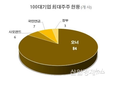 5% 이상 주주가 아닌, 지분이 가장 많은 최대주주의 경우에는, 오너 주주가 최대주주인 기업이 100대기업 가운데 84개사로 가장 많았고 사모펀드가 최대주주인 기업은 6개로 조사됐다. 하지만 이렇게 오너 주주가 숫적으로는 압도적으로 많지만, 지분율로 볼 때는 오너주주가 42.8%인 반면, 사모펀드는 21.6%나 차지하고 있다.