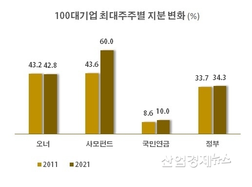 전경련의 이번 조사에 따르면, 100대 기업의 5% 이상 지분을 보유한 대주주들의 지분은, 사모펀드가 2011년 14.4%에서 2021년 21.6%로 7.2%p 증가하며 가장 많이 확대됐다.