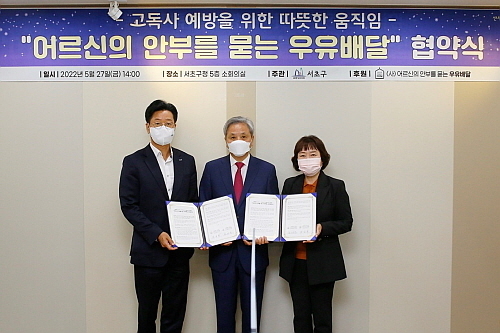 (사)어르신의 안부를 묻는 우유배달’(이사장 호용환 목사)는 지난달 27일 서초구청에서 독거 어르신의 건강과 안부를 묻는 우유 배달을 위한 업무협약을 진행하고, 6월부터 약 150명의 서초구청 어르신들에게 우유 배달을 시작한다고 밝혔다.