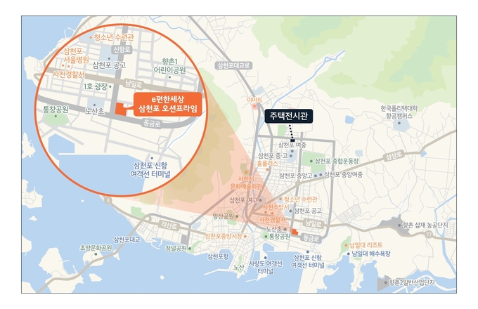 e편한세상 삼천포 오션프라임은 삼천포 도심을 가로지르는 남일로와 삼상로, 중앙로 등 주요 도로가 인접해 삼천포 일대는 물론, 사천시 전역으로 수월하게 이동할 수 있다. 도보권에는 버스 정류장 6개소가 위치해 대중교통을 이용한 이동이 편리하다. 이 밖에 차량으로 약 5분 거리에 삼천포 터미널이 있으며, 사천시외버스터미널과 사천공항까지 30분대에 이동할 수 있어 광역 교통망 이용도 쉽다.