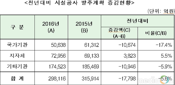 올해 국가기관, 지자체, 공기업 등에서 발주할 시설공사 집행계획 규모는 지난해의 31.6조원보다 5.6%(1.8조원) 감소했다.