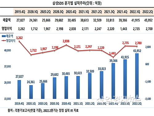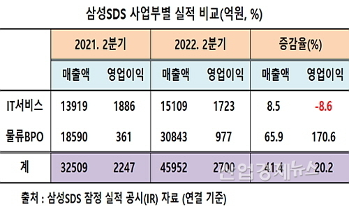 삼성SDS IR자료에 근거해 연결재무제표 기준 2분기 실적을 살펴보면, 먼저 매출은 4조5952억 원을 시현해 전년 동기 3조2509억 보다 약 1조3443억이 늘어 41.4% 증가했고, 영업이익 역시 2700억 원을 기록, 전년 동기 2247억 대비 약 20.2% 신장했다.