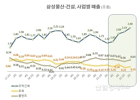 매출에서 가장 큰 비중을 차지하는 건 역시 주택건축사업이다. 올해 2분기에 2.4조원으로 전년보다 52.9%나 증가하면서 회사 매출에서 70.6%를 차지했다. 최근 5년 동안 가장 높은 실적이다.