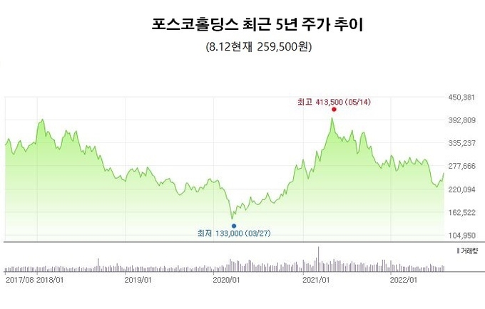 포스코홀딩스의 주가는, 자사주소각과 배당이 발표된 12일 0.97% 오른 259,500원에 마감해, 지난해 5월 413,500원 보다 여전히 많이 낮은 수준에 머물러 있다.
