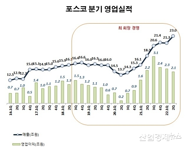포스코홀딩스는 2018년 최정우 회장이 취임한 이래, 최근 1년 동안 역대 최고 경영실적을 기록하고 있다. 최 회장 취임 초기 실적하락으로 마음고생을 했던 회사는, 지난해부터 매출도 영업이익도 지속적으로 상승하며 창사 이래 최대 실적을 보여주고 있다.