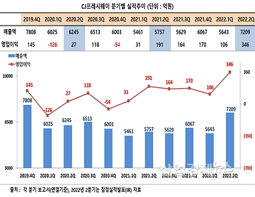 CJ프레시웨이가 밝힌 2분기 실적 IR자료에 따르면 먼저 주력사업인 식자재유통 매출은 약 5559억 원으로 전년 동기 4399억 대비 약 26.4% 증가했다.
