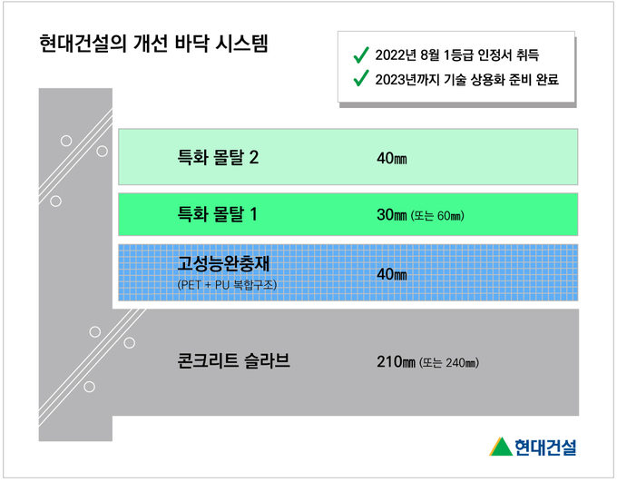 통상 콘크리트 슬래브나 온돌층으로 구성된 바닥 두께 증가를 통해 1등급 달성을 추진하는 것이 일반적이나, 현대건설의 1등급 바닥구조는 기존 바닥 두께를 유지하면서도 1등급 성능을 확보한 시스템이 포함돼 기술선도기업의 독보적인 역량을 입증했다.