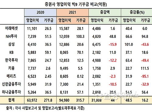 이들 9개 증권사 모두 영업이익이 2020년 대비 큰 폭 증가한 와중에서 미래에셋, NH투자, KB, 키움, 하나금융투자(이하 하나증권) 등 5개사는 기부금 지출을 늘린 반면에 삼성, 한국투자, 신한금융투자, 메리츠 등 4개사는 되레 줄인 것으로 나타나 대조를 보였다.