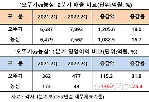 이로써 양사의 올 2분기 실적은 매출 증가율과 영업이익 증가율 모두 오뚜기가 농심을 앞섬으로써 ‘완승’을 거둔 것으로 봐도 무방할 것 같다는 것이 업계의 평가다.