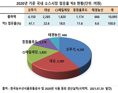 이중 소스류 출하금액 기준 상위 5개사의 점유율은 오뚜기가 약 4150억 원(점유율 41.1%)로 톱을 달리고 있고, 이어 ㈜대상이 2285억(점유율 22.6%)으로 2위, CJ제일제당 1820억(18.0%), 동원홈푸드 1174억(11.6%), 태경농산 666억(6.6%)의 순으로 시장을 이끌고 있다.