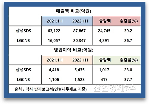 삼성SDS의 올 상반기 연결영업이익이 5435억으로 전년 동기 4418억 원 대비 23.0% 증가한 반면에 LG CNS는 전년도 1106억 원에서 올 상반기 1523억 원을 시현하며 37.7% 신장해, 삼성SDS를 증가율 기준으로 약 14.7% 포인트 앞서 우위의 성적표를 만들어 낸 것.