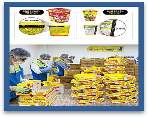컵라면 용기에 점자를 표기해 시각장애인의 정보 접근성과 취식 편의성을 높이는 것은 물론, 장애인들의 ‘일할 권리’를 보장하기 위해 2012년부터 약 10년 간 밀알복지재단 굿윌스토어에 물품 후원 및 임가공을 위탁하여 장애인 직원들에게 일감을 제공해오고 있다.