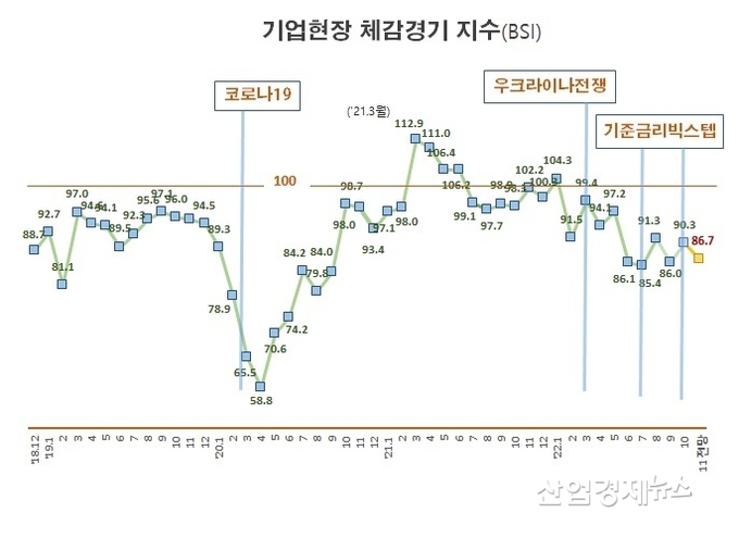 전국경제인연합회(이하 전경련)가 매출 600대 기업을 대상으로 실시한 기업경기실사지수(BSI : Business Survey Index)를 조사한 결과, 11월 BSI 전망치는 86.7을 기록했다고 발표했다. 코로나19가 한창이던 2020년 10월 84.6 이후 25개월 만에 최저 수치를 나타냈다. 전경련은 이런 조사결과에 대해 '기업심리 빙하기'라고 설명했다.