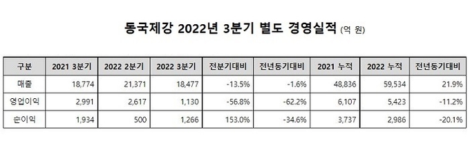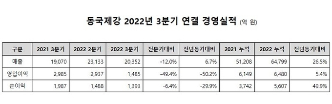 한편, 동국제강은 글로벌 복합 위기 선제 대응을 위해 브라질 CSP 제철소 매각 및 중국법인(DKSC) 지분 정리 등을 통해 3분기 재무 구조를 개선할 수 있었다.