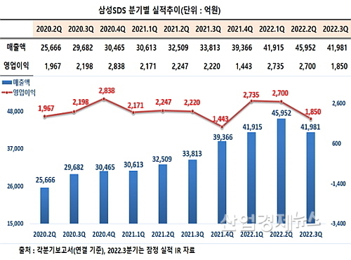 삼성SDS 측 IR자료에 근거해 연결재무제표 기준 3분기 실적을 살펴보면, 먼저 매출은 IT서비스와 물류 사업부의 쌍끌이 선전에 힘입어 약 4조1981억 원을 시현, 전년 동기 3조3813억 보다 8168억 가량이 늘어 24.2% 증가했다.